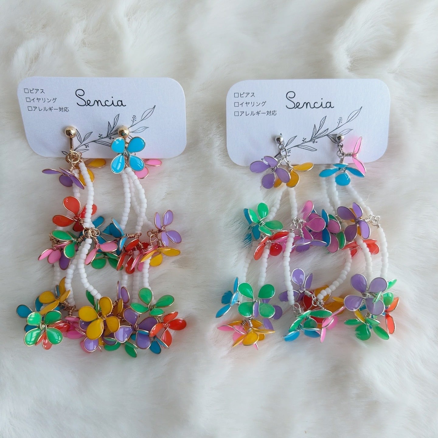 ワイヤーの一部にマニキュアを施し、華やかさと個性を引き立てます。仕上げにはレジンでコーティングを施しているため、光が当たるとキラキラと輝く仕上がりになっています。